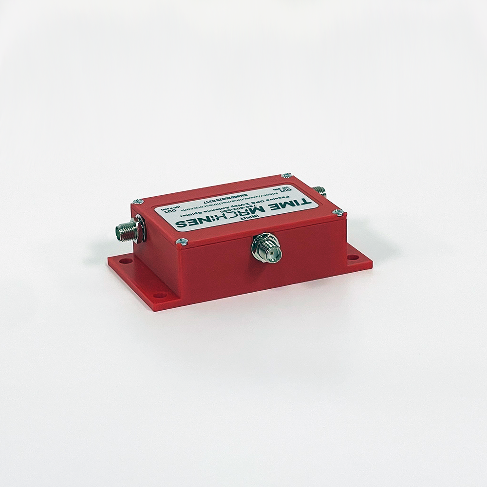 The TimeMachines™ 2 Way GPS Splitter allows using one antenna with two GPS Time Servers such as the TM1000/2000/2500. This passive device connects antenna amplifier power through one of the output ports to the antenna using the power provided by the time server. The second port is DC blocked. No changes in setup of the TimeMachines™ Time Servers are required to use this device. Compatible with other vendors GPS based time server products, see documentation for more information. Works great with the puck antennas provided with our time servers as well as our conical 40dB outdoor antenna. If there are multiple time servers co-located, this product can save running multiple antenna cables.