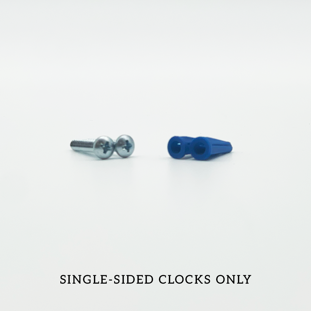 2 screws and 2 plastic hollow wall anchors (Single-sided clocks only).